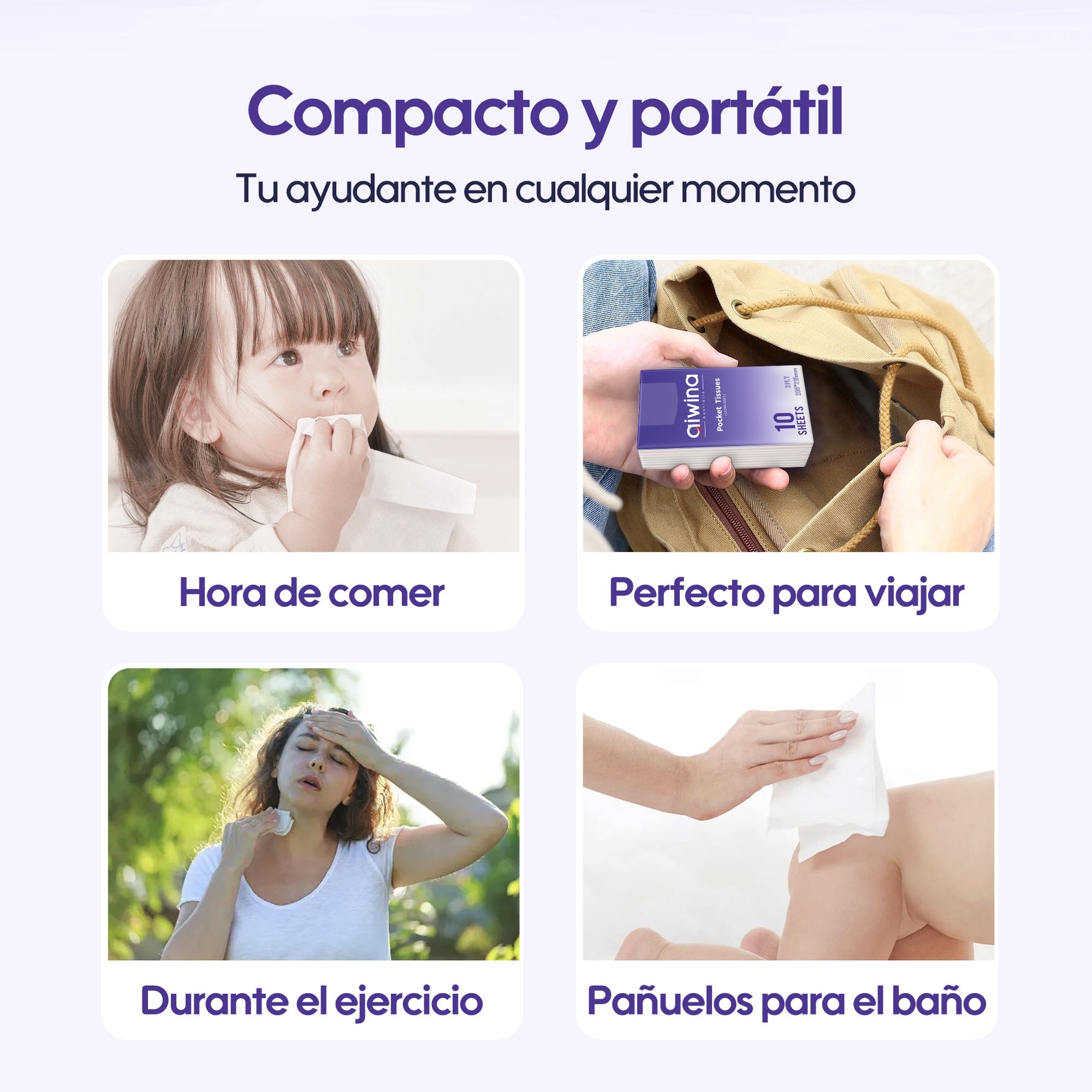 Fabricados con pulpa de madera virgen de primera calidad, los pañuelos de bolsillo Aiwina son suaves y absorbentes, brindándote una comodidad delicada para cualquier necesidad. Cuentan con un diseño de dos capas que ofrece el equilibrio perfecto entre grosor y eficacia, permitiendo una limpieza efectiva sin desperdicio.