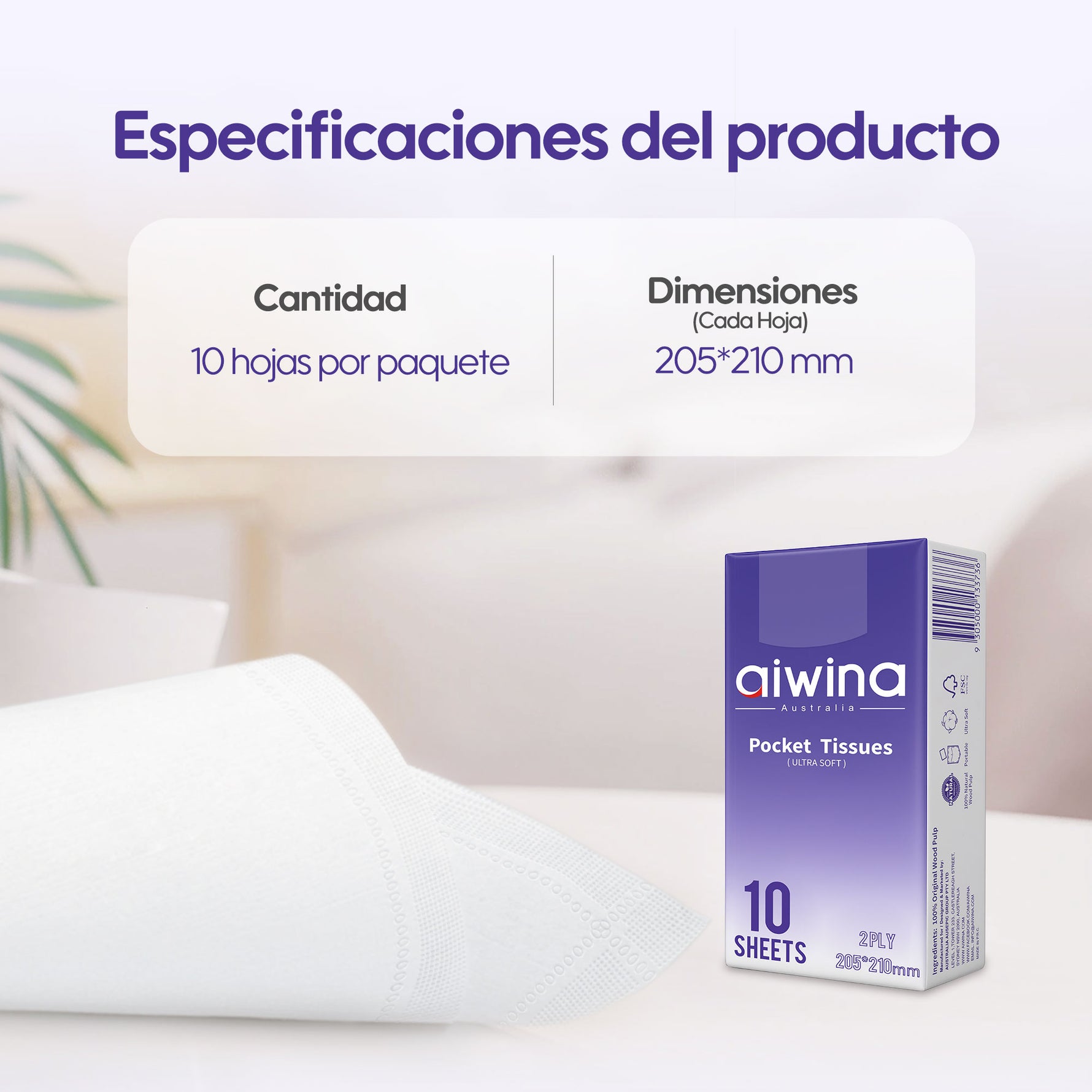 Cada paquete contiene 10 pañuelos, con un tamaño de 205*210 mm: compactos, prácticos y fáciles de llevar. Tanto en casa, de viaje o durante tus salidas, estos versátiles pañuelos están preparados para satisfacer todas tus necesidades de limpieza, desde retoques rápidos hasta limpiezas esenciales.