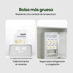 Llenado: Puede conectar su extractor de leche directamente a la bolsa o usar la abertura principal.