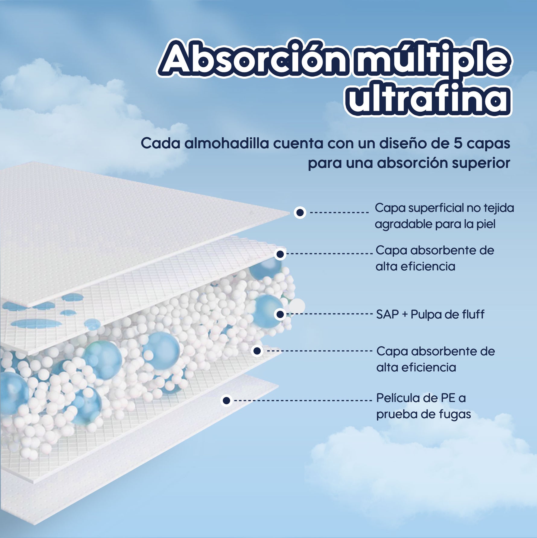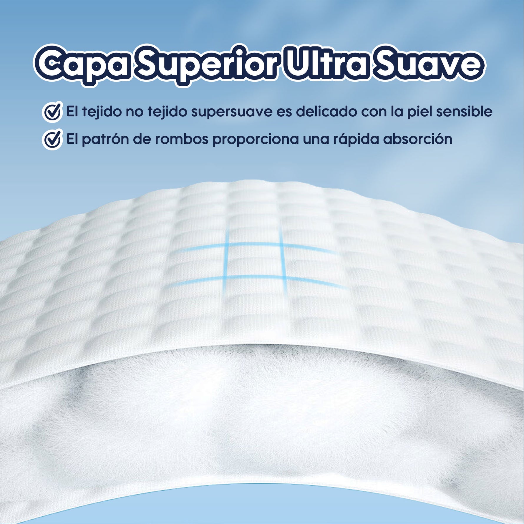 Nuestros pañales cuentan con una construcción ultradelgada de cinco capas que mejora la absorción. La capa superior con diseño de rombos absorbe rápidamente la suciedad, manteniendo a tu bebé seco y cómodo.